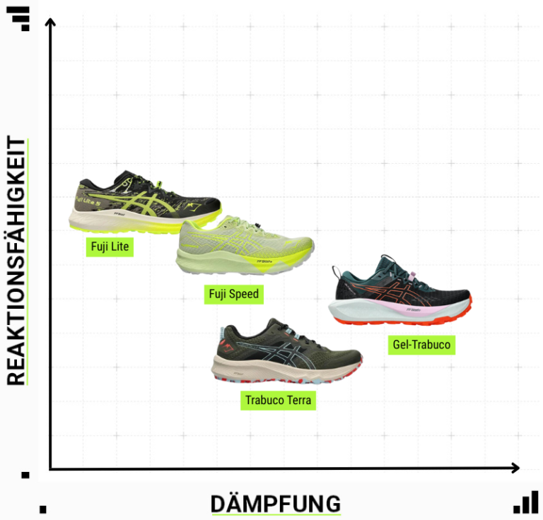 Trailrunner können sich bei ASICS ebenfalls gut aufgehoben fühlen. Das Sortiment umfasst die gesamte Bandbreite an Trailschuhen, von gut gepolsterten Modellen mit mehr Schutz und Dämpfung bis zu minimalistischen Leichtgewichten für richtige Tempoläufe im Gelände.