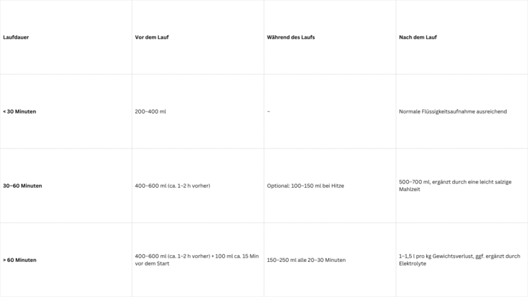 Überblick einer Trinkempfehlungen je nach Laufdauer