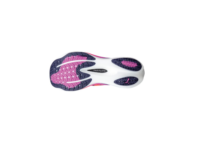 Die in der Zwischensohle integrierte PWRPLATE, eine von PUMA entwickelte Carbonfaserplatte, sorgt für zusätzliche Stabilität und unterstützt eine effizientere Abrollbewegung. Zusätzlich bietet die PWRPLATE einen kräftigen Vortrieb und hohe Flexibilität bei intensiver körperlicher Belastung.